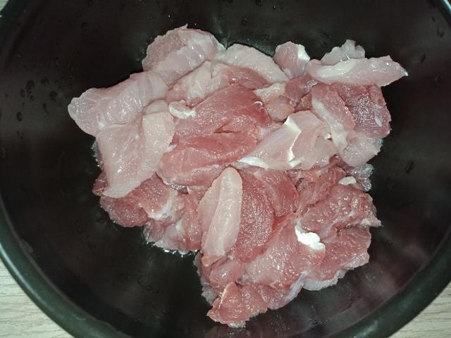 步骤三:锅里倒油烧热,放入蒜炒香,再放入小米椒跟瘦肉加入一勺盐