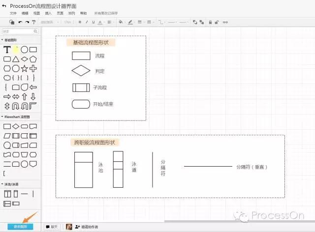 在具体操作中,把鼠标放在左侧图形上面会显示每个图形代表的含义。上图只呈现了基础常用的图形,左下角点击“更多图形”可添加更多素材。