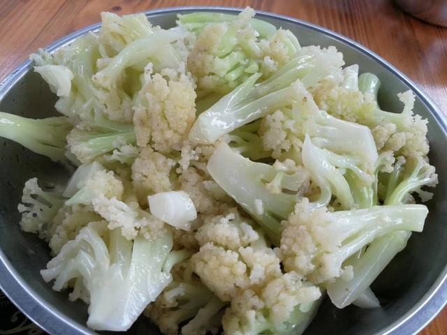 1.起锅烧油至5-6成油温,下入菜花,看菜花颜色成翠绿色迅速捞出控油。(家里做油少放!)