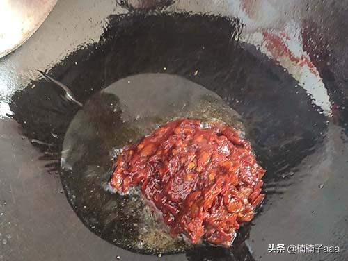 2、锅中放入底油,待油热后放入郫县豆瓣翻炒30秒,一定要不停的搅拌,以防粘锅。