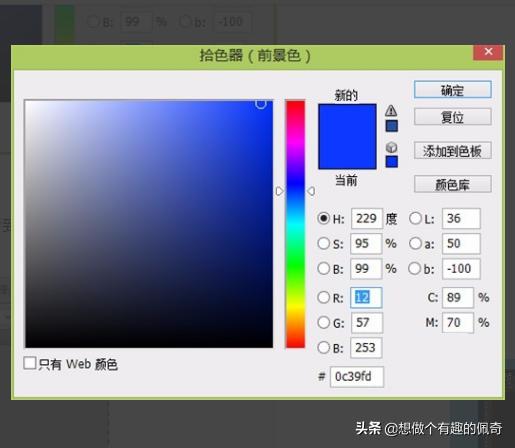 4、点击工具栏的前景色,就是上面的那个方块,进入拾色器界面,点击蓝色,选中蓝色,点击确定,如图所示:
