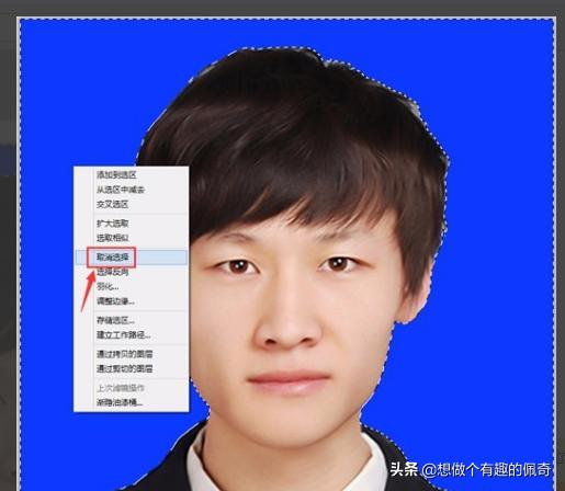6、点击工具栏的魔棒工具,到图片中被选中的区域鼠标右键点击,然后在弹出的选项中点击“取消选择”,如图所示:
