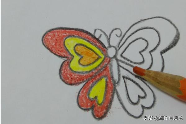 10.再用紫色将右上方大翅膀最里面的桃心涂上颜色,现在让孩子们看看,左侧的翅膀是红、橙、黄三种暖色涂的,右侧翅膀是蓝、绿、紫三种冷色涂的,左边翅膀看上去轻盈、明快,看着十分温暖,右侧的翅膀看上去宁静、凉爽,中间的头部和身体是中间色白色,冷暖色搭配在一起,颜色更加协调、十分漂亮。