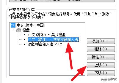 3、跳出对话框,在键盘处点击,中文简体搜狗拼音输入法,选中以后点击上移。