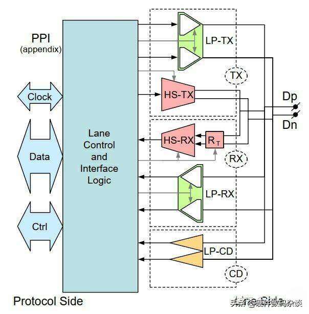 根据上图,我们看到Universal Lane里面有一对高速收发器(HS-TX、HS-RS)、一对低功耗(Low Power)收发器(LP-RX、LP-TX)、低功耗竞争检测器(LP-CD)和Lane的控制逻辑组成。其他类型的lane都是在这个基础做一定的简化,比如单向数据传输通道就只有接收器或者发送器,再比如时钟lane也是只有接收器或者发送器,也就是说时钟也是一种lane。