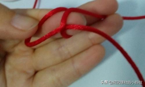 2、要把红线对折用拇指捏住放在食指上,把上边的线绕食指一圈,如下图。