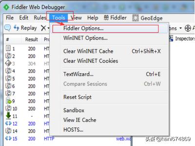 1.首先fidler,打开Fiddler,在上方菜单栏的【 Tools】中找到【 Fiddler Options】,点击打开。