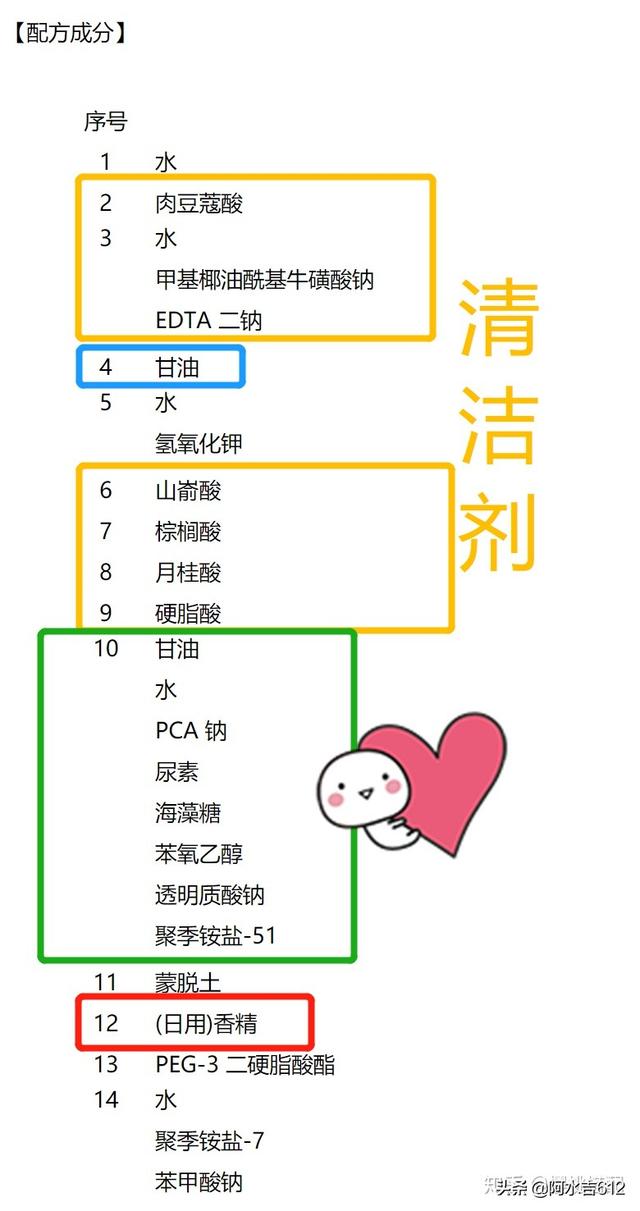 黄色方框标注的是清洁剂类成分,作为给洗面奶扛大旗的功效成分。绿色方框加爱心图标的是皮肤调理剂。蓝色方框标注的是保湿剂。现在针对成分含量由多到少的顺序来分析一下: