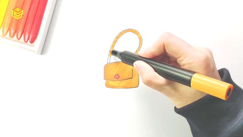 2、接着来上色,用红色给纽扣上色,橙色给包包和带子上色,这样挎包就画好了!