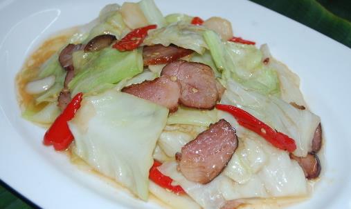 【原料】:圆白菜、腊肉少许、青蒜、红尖椒