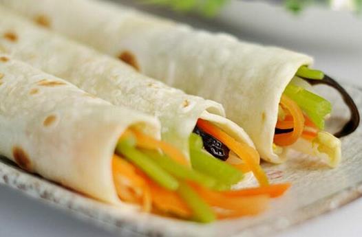 将筷子放在春饼上,将春饼的一边顺着筷子卷起来,下端往上包好,用手捏住,再卷起另一边,卷好了放在盘子上,再将筷子一根一根地提出来。手法高的人卷出的春饼卷大小会跟自己的嘴一样大,方便咬食。这种卷法也同样适用于烤鸭,下次吃的时候您别忘了试试。