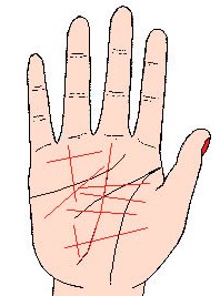 横越手掌的无数障碍线,与其他竖线有如网一般交叉,以致分不出何线接连何线,极为复杂,我们常看见这种手纹;通常皮肤至为坚硬,而且粗燥不光滑,同时线条有如网的人,表示金钱上至为操劳,手掌皮肤柔软,而线条如同网的人,其主要线条难於分别,这类相的人或神经质或知能不大灵活,这手相以女性为多,同时处世欠缺圆滑的人,也常有此相。